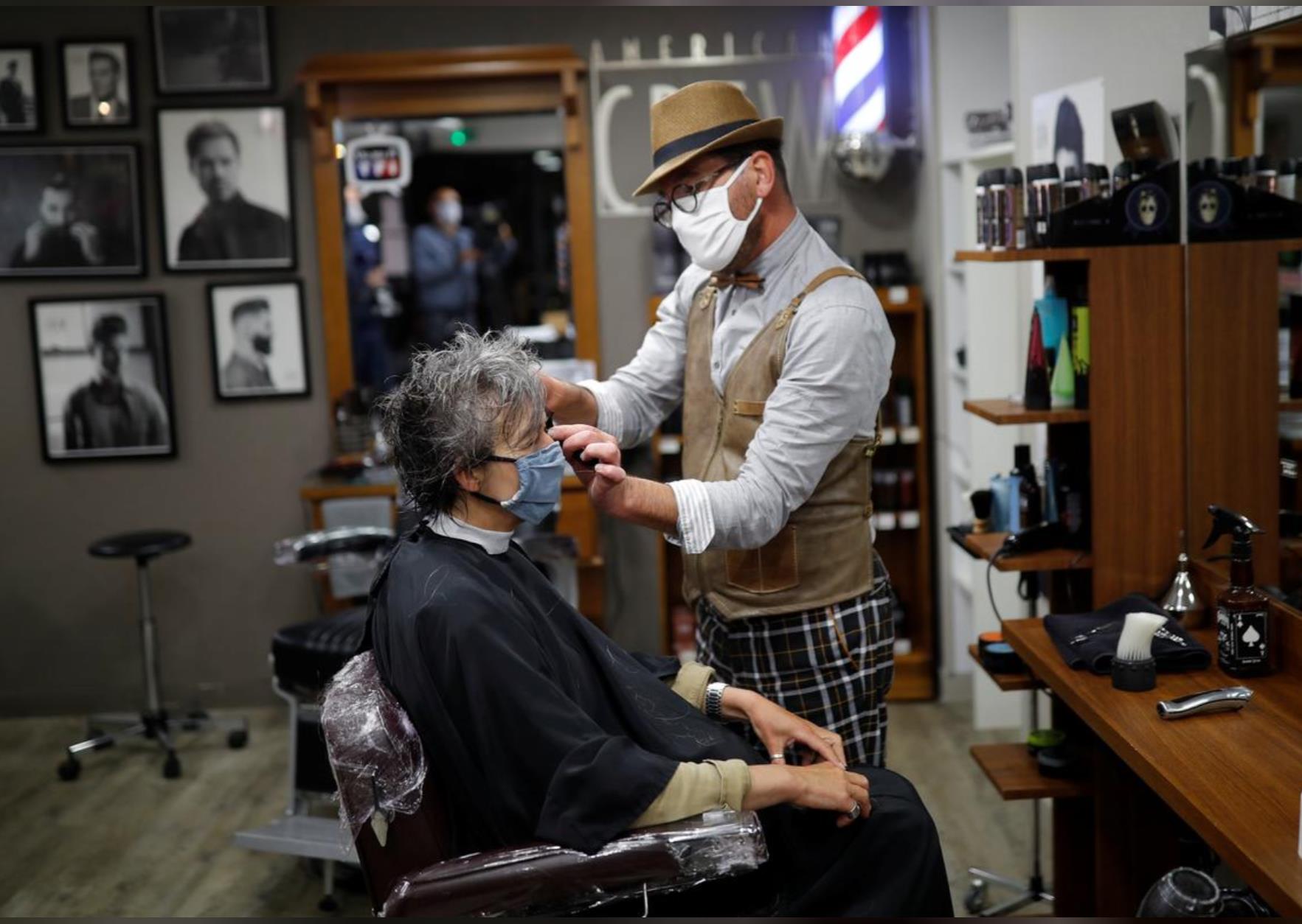 午夜到访的顾客是卡罗琳·科尔博(Caroline Corbeau),打算换个新发型进入解封之后的新生活。她和毛尼都戴着口罩,理发椅上还盖着塑料膜。