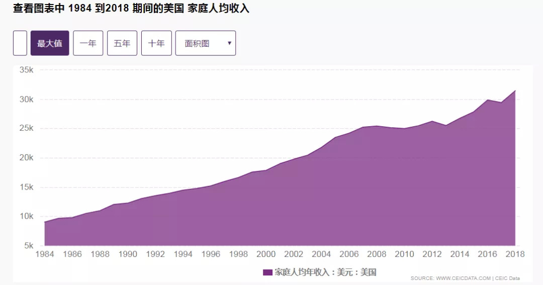 有个数据显示,2018年美国家庭人均收入是3.15万美元。