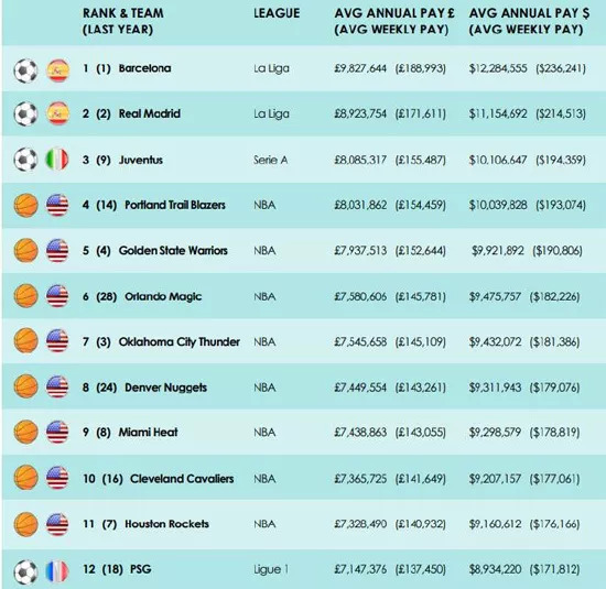 2018年各俱乐部球员平均年薪,前12位NBA占8席