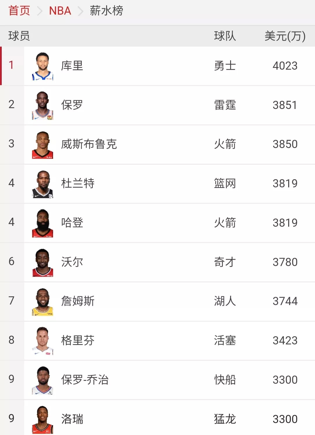 据虎扑篮球披露,目前库里的年薪为4023万美元(约2.8亿人民币),保罗、威斯布鲁克、杜兰特、哈登等当红球星,年薪皆超过3000万美元。