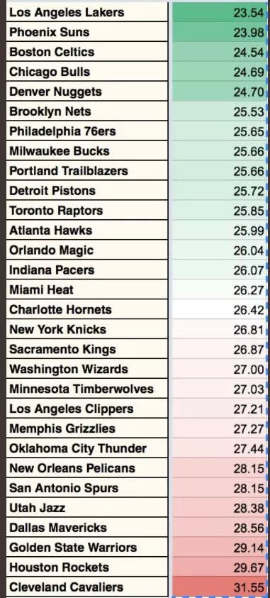 NBA各球队球员的平均年龄