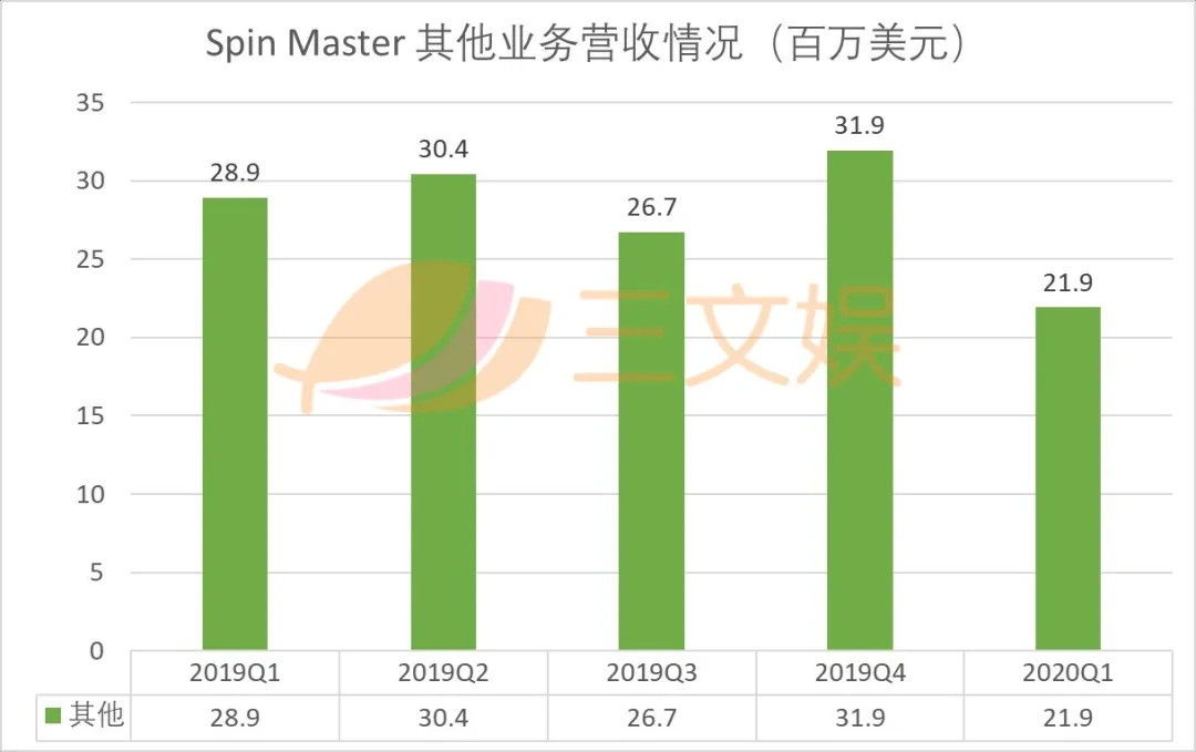 Spin Master还有自己的内容业务和幼儿游戏App业务,不过这一块业务没有单独拿出来,而是被归类到了“其他”里。一季度Spin Master的其他业务营收2190万美元,同比下滑了24.2%。收入下滑的原因是IP授权费和电视发行的收入变少了。