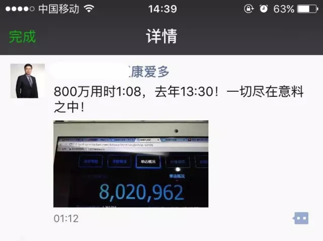 01:12,康爱多CEO王燕雄同样通过朋友圈渠道,公布其销售额已经突破800万。