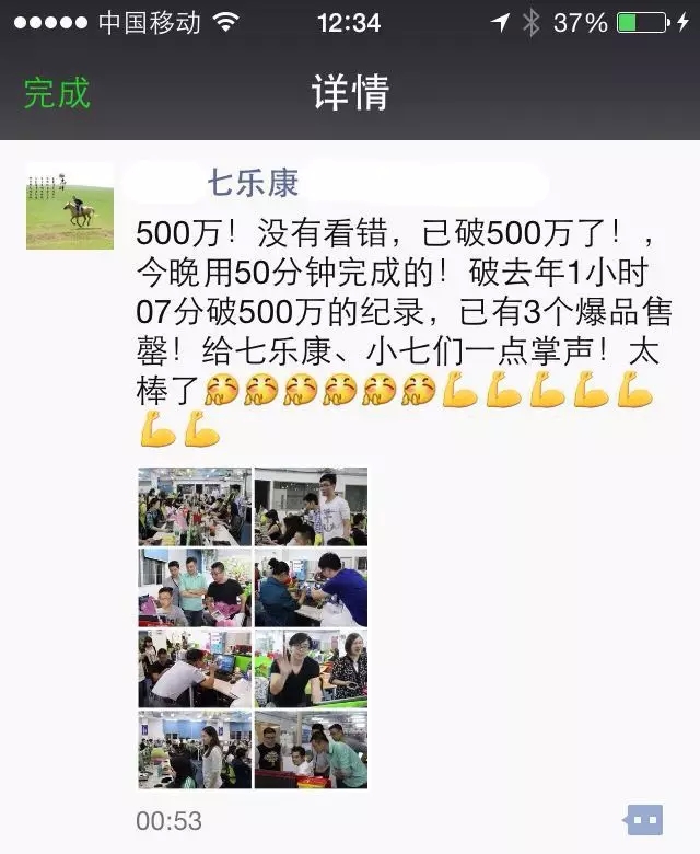 00:53,石振洋再次通过朋友圈发文公布七乐康用了50分钟突破500万的销售额。(之后截止到交稿时间,七乐康都没有数据的更新信息。)