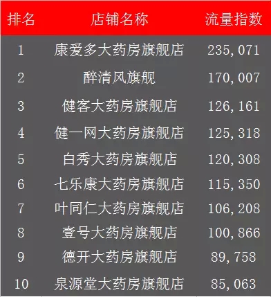 截止到发稿前,从生意参谋上获得的天猫流量指数和交易指数排名(截止至16:34)来看,康爱多分别以235,071和1,062,596占据第一位置。榜单上大多为医药电商熟面孔,其中醉清风旗舰和泉源堂大药房旗舰店算是两匹大黑马(文末有这两家企业的简介链接)。