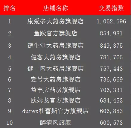 从天猫的流量指数和交易指数的前十名榜单来看,医药电商还是主力军,但是有趣的是,小编发现几年他们在朋友圈相对低调,健客网、健一网、壹号大药房、德开大药房等都很节制,很少在朋友圈里晒战绩。(事实应该是小编已经被他们屏蔽了,等一下,我要去厕所哭一会。)