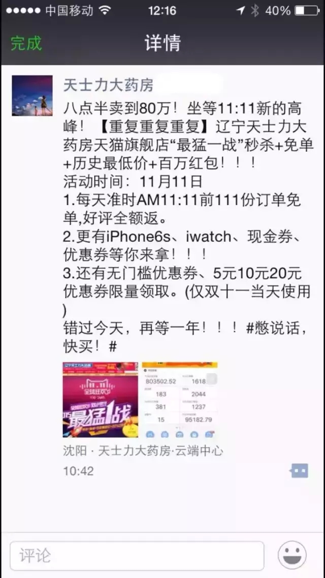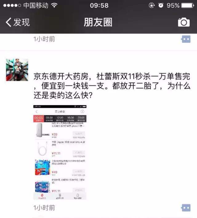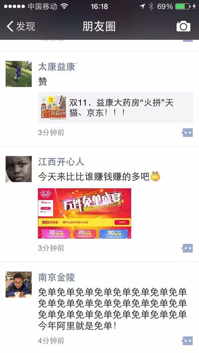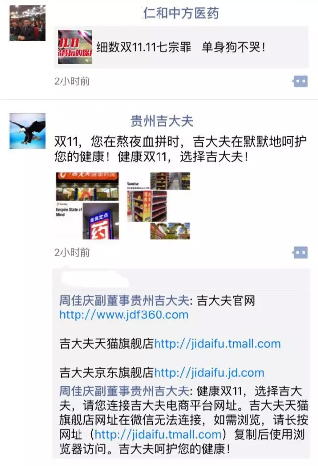 除此之前,不少传统连锁今年对“双十一”的热情都可以从朋友圈中体现出来(由于小编朋友圈刷屏太快且容量有限,肯定还有不少企业的身影未被挖出来)。