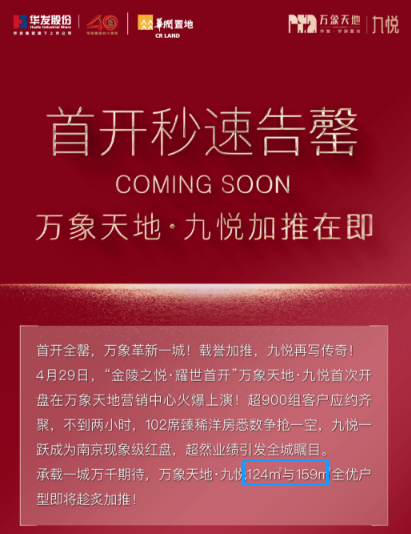 万象天地九悦4月29日首开3、6号楼,共计102套精装房源,面积98㎡,均价3.6万/㎡,价格创下燕子矶新高,开盘两小时便售罄。
