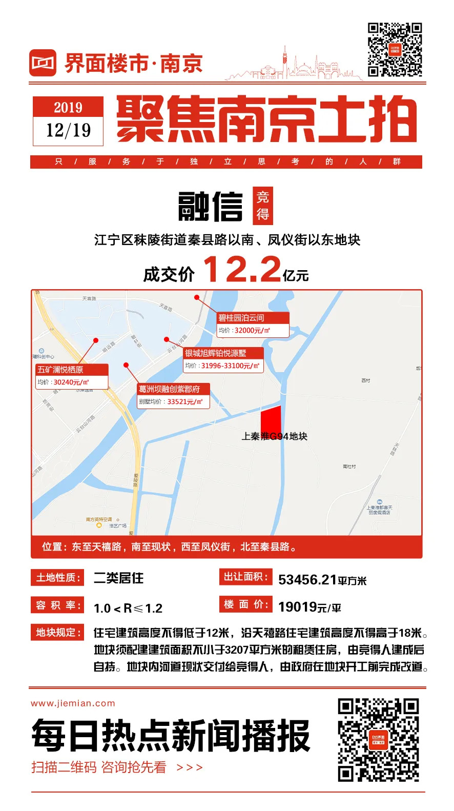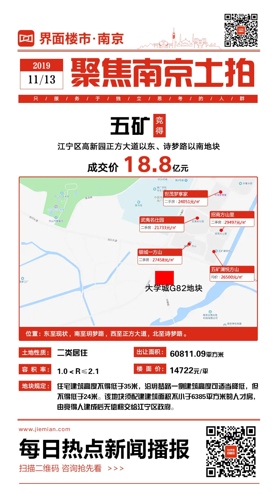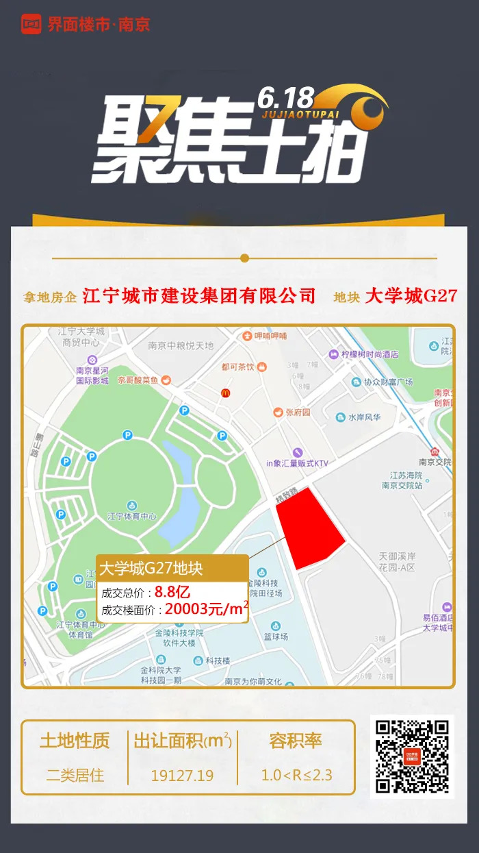 该地块位于大学城核心区,在2019年6月18日土拍中,经过21轮竞拍,被江宁城建集团以总价8.8亿拿下,楼面地价为20003元/㎡。