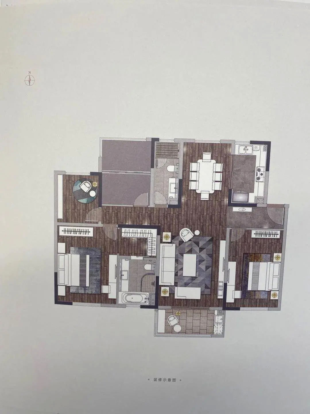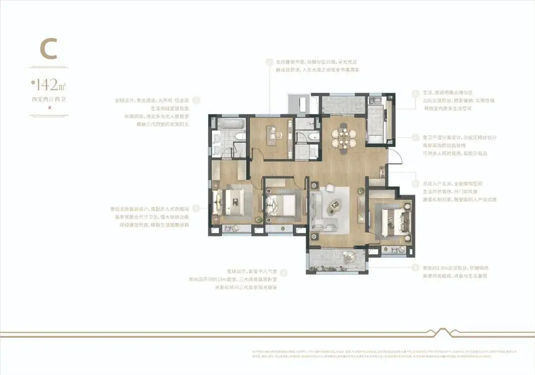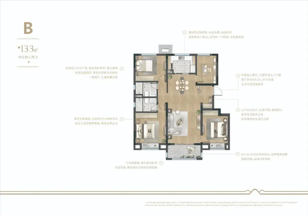 150㎡户型是四室两厅两卫设计,三开间朝南,南北通透;主卧是套间设计,面宽3.9米。