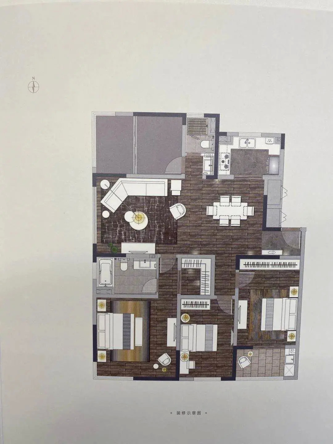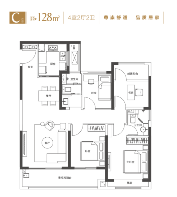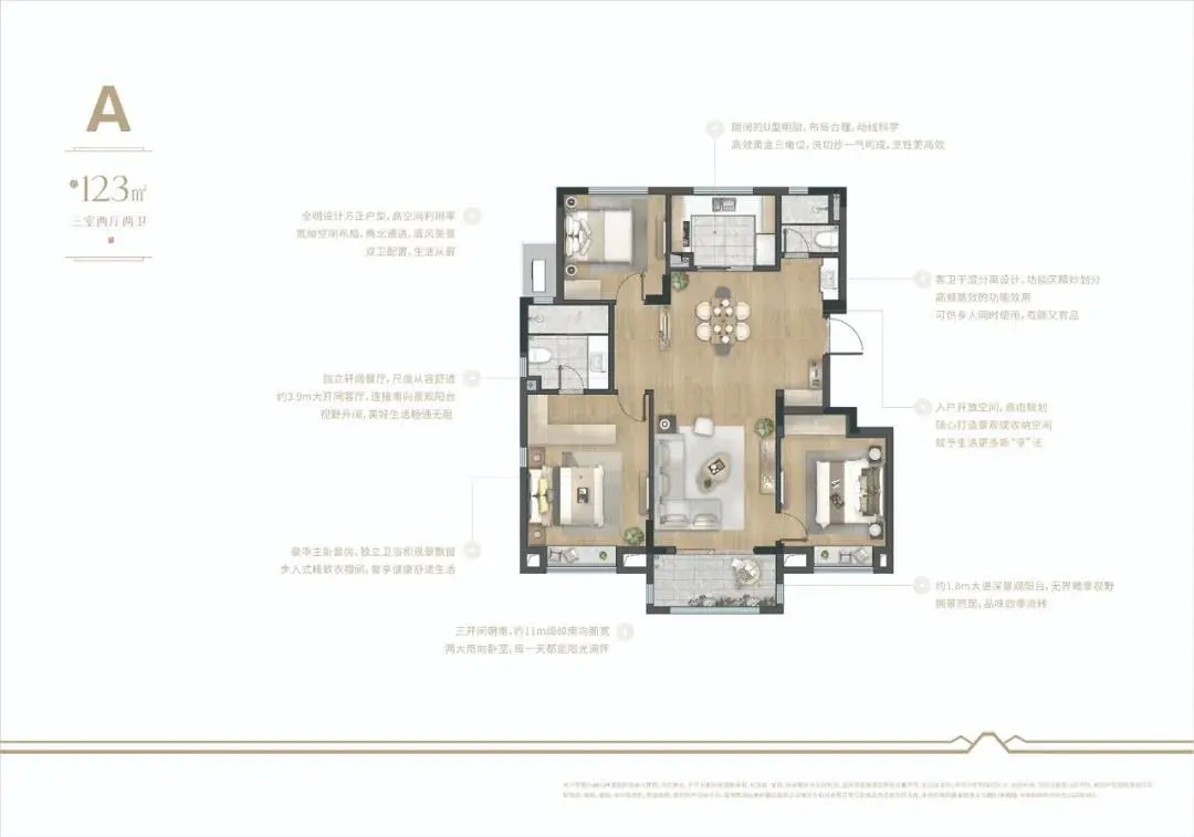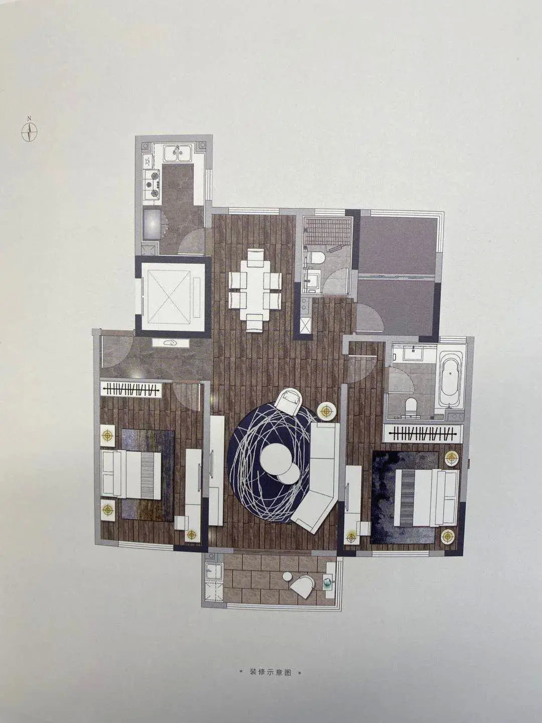 130㎡户型是三室两厅两卫设计,三开间朝南,4.2米超大尺度阳台,主卧是套间设计,客厅开间4.2米,南北通透。