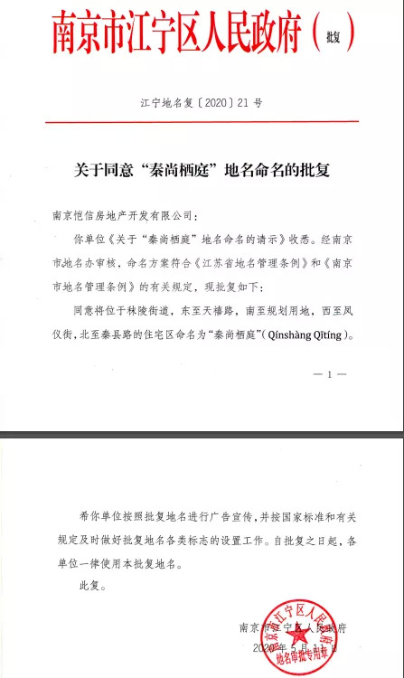 5月11日,江宁区政府关于融信上秦淮G94地块案名的批复公示了,起案名定为“秦尚栖庭”。