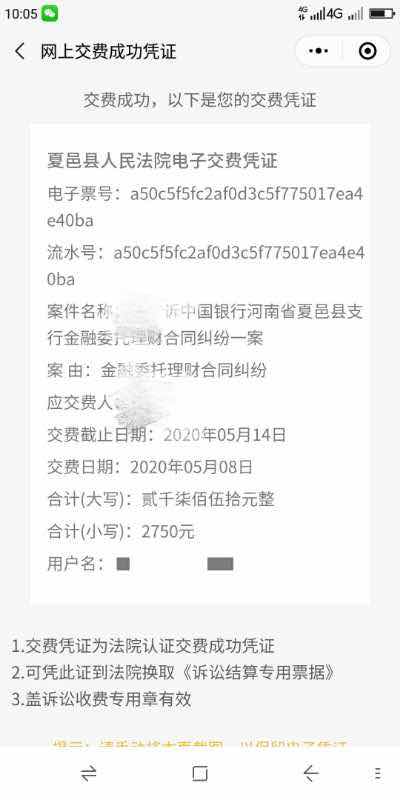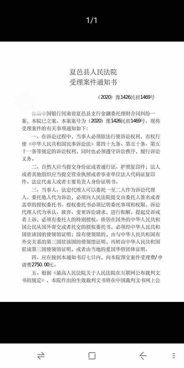 此外,另一份流传较广的立案通知书也获得本人证实,该通知书抬头为夏邑县人民法院,内容称:你诉中国银行河南省夏邑县支行金融委托理财合同纠纷一案,本院已经立案。并告知该投资者受理案件的五项通知:1、当事人必须遵守诉讼秩序,履行诉讼义务;2、当事人需提交相关证明;3、可委托1-2人作为诉讼代理人;3、在接到本通知书后7日,需预交案件受理费2750元;5、裁判文书将在中国裁判文书网上公布。