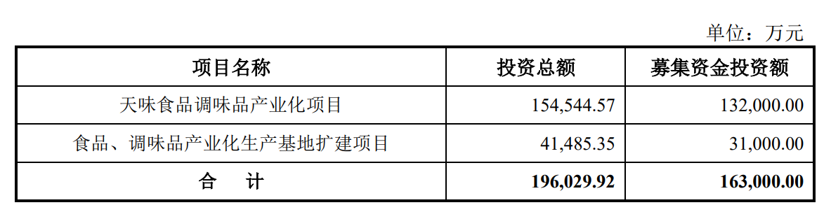 据天味食品5月13日披露,公司计划向不超过35名的特定投资者发行股票,发行数量以发行募集资金总额(不超过16.3亿元)除以发行价格确定,且不超过1亿股,发行股份不超过发行前公司总股本的30%,所募资金将投入“天味食品调味品产业化项目”(拟投入13.2亿元)和“食品、调味品产业化生产基地扩建项目”(拟投入3.1亿元)。