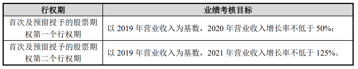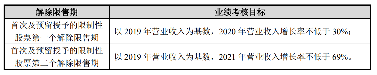 首次及预留授予的限制性股票解除限售考核年度也为2020—2021年两个会计年度,每个会计年度考核一次,即第一个解除限售期之际需要公司“以2019年营业收入为基数,2020年营业收入增长率不低于30%”;第二个解除限售期时,要达到“以2019年营业收入为基数,2021年营业收入增长率不低于69%”的要求。