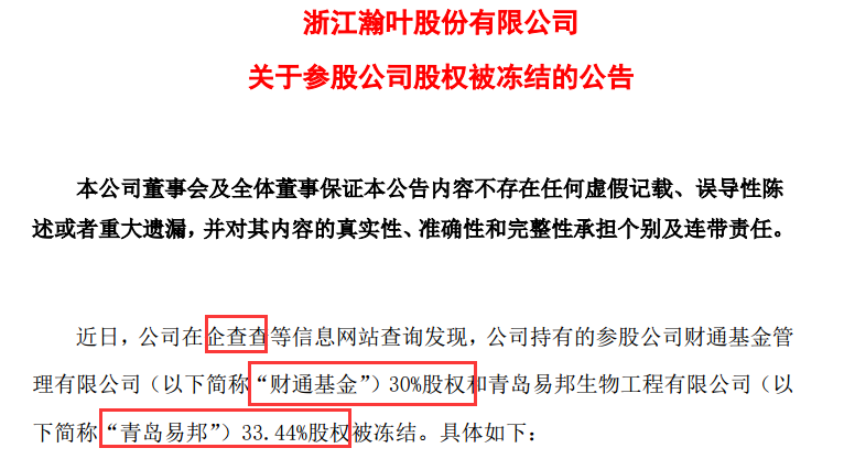 值得一提的是,瀚叶股份在公告中表示,公司是“在企查查等信息网站查询发现”才知道上述两家参股公司股权被冻结的。