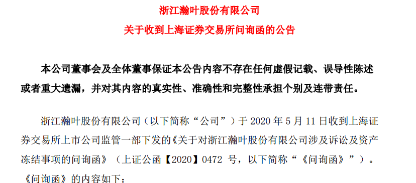 很快,上交所便向瀚叶股份下发问询函,要求瀚叶股份就公司控股股东股份冻结、子公司股权冻结以及公司担保行为等情况,说明原因、是否存在资金占用、违规担保等损害上市公司利益等问题。