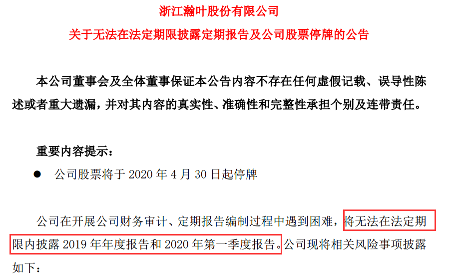 4月30日,瀚叶股份披露公告称,根据有关规定,公司因无法在法定期限内披露2019年年度报告,公司股票将于2020年4月30日起停牌。