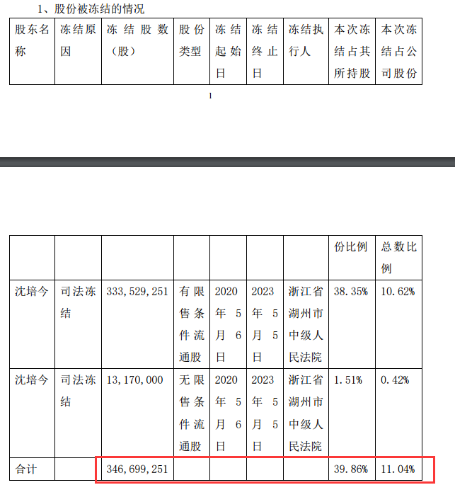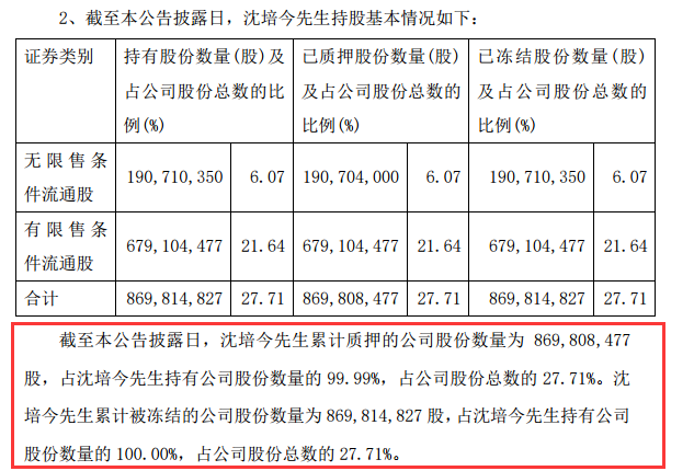 5月8日公司公告称,沈培今所持3.466亿股被司法冻结,该部分股份占公司股份总数的11.04%。