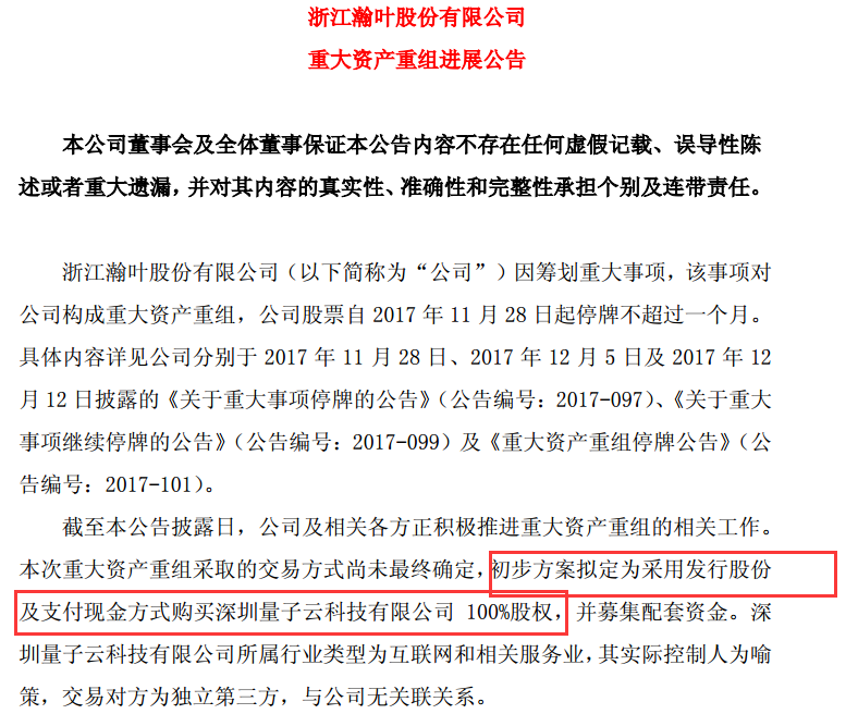 2017年底,瀚叶股份发布重大资产重组预案,拟作价38亿元,收购深圳量子云科技有限公司(下称量子云)100%股权。