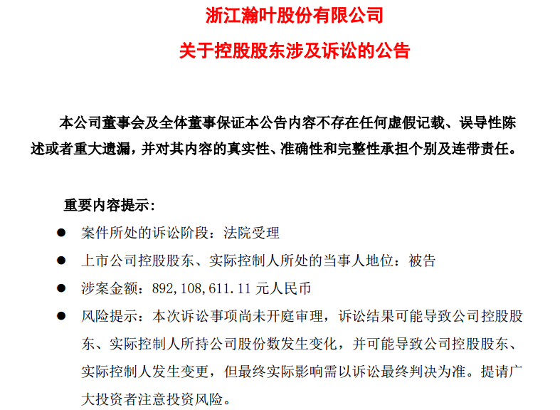 5月12日晚,国内新型农药、兽药企业瀚叶股份披露了关于控股股东涉及诉讼的公告。