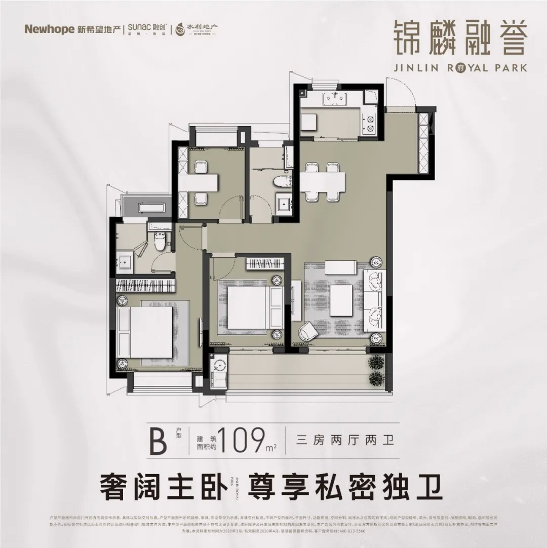 B户型:建筑面积约109㎡ 三房两厅两卫