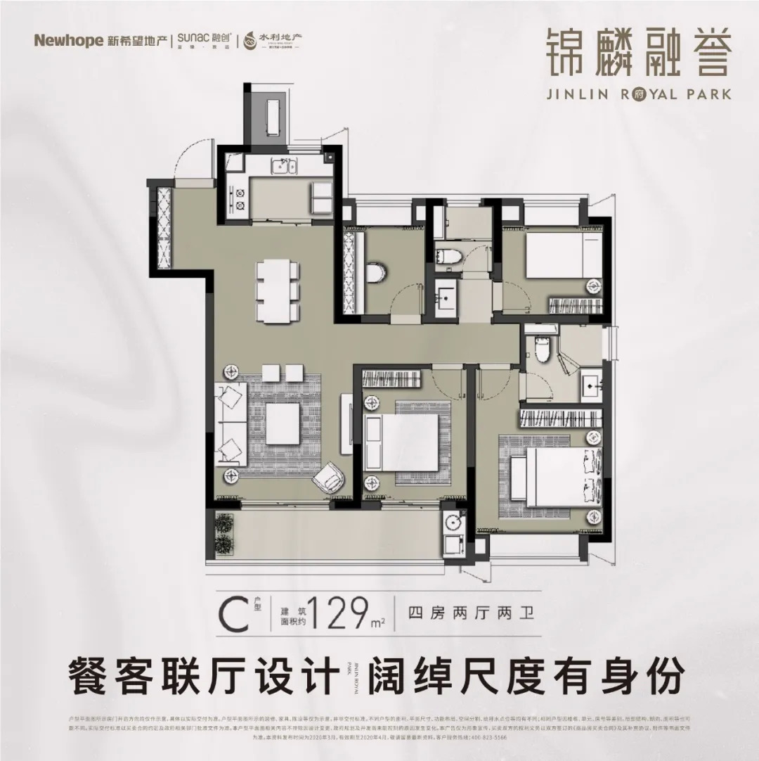 C户型:建筑面积约129㎡ 四房两厅两卫