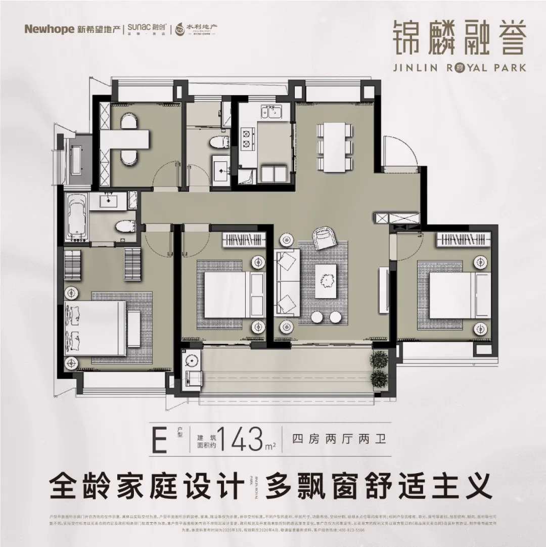E户型:建筑面积约143㎡ 四房两厅两卫
