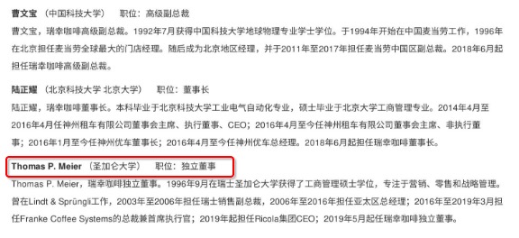 在何刚离职之前,4月21日,独立董事托马斯·卖耶(Thomas Meier)也向瑞幸公司提交了辞职信,该辞职在当日生效。