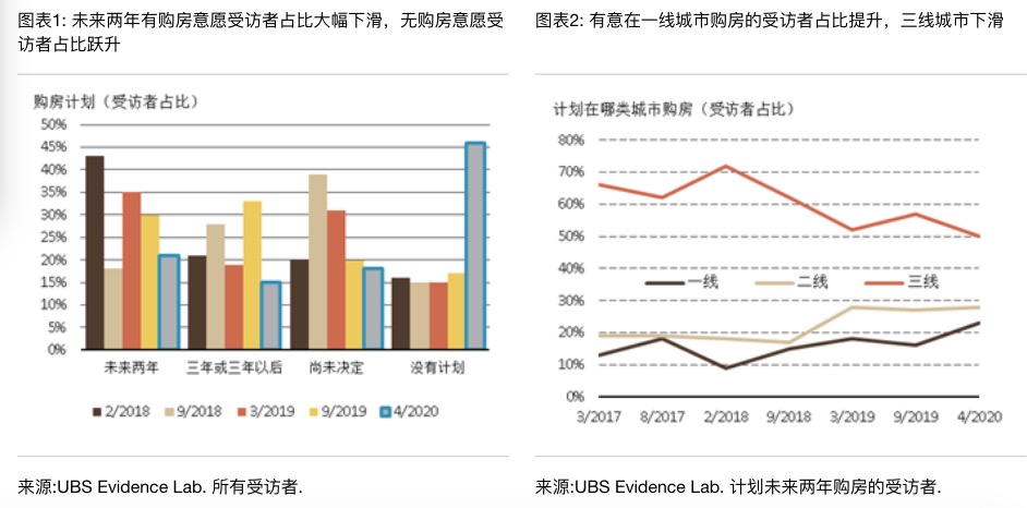 其中,在2020年有购房意愿的受访者占比从2019年3月调查时的12%降至10%。此外,“无购买意愿”受访者占比跃升至46%,创历史新高(2019年调查时为15-17%,而此前调查结果在8-26%之间),该比例在各线城市中均有所上升、尤其是二三线城市。