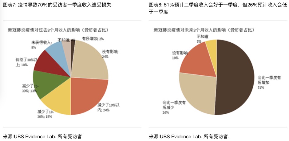 疫情严重影响一季度居民收入,但51%的受访者预计二季度收入会有所增加。本次调查显示,疫情导致70%的受访者一季度收入遭受损失(与正常水平相比),加权平均降幅为19%。其中,8%表示失去了全部月收入,可能是面临裁员或雇主暂时停止发薪(详见我们的劳动力市场报告)。朝前看, 51%的受访者预计二季度收入会好于一季度,但其中21%预计收入水平仍会低于去年同期(2019年二季度)。另一方面,所有受访者中仍有26%预计二季度收入会低于一季度。本次调查收入预期偏保守,这也与“把脉消费”问卷调查的结果基本一致(该调查中有42%的受访者预计今年下半年收入会有所增加,15%预计收入会有所下降)。