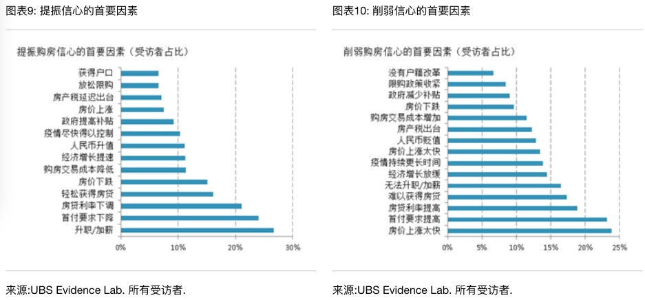 房贷、收入和房价是影响房地产市场情绪的首要因素。受访者表示首付比例下降、房贷利率下调,以及房贷可得性提高等是提振其购房信心的首要因素,其他因素还包括升职或者加薪;反之则会削弱购房信心。同时,房价上涨过快是削弱购房信心首要因素之一,而房价下跌则能提振购房意愿。这些结果表明,若政府选择刺激房地产行业,大幅降低首付比例要求和/或房贷利率可以显著提振房地产销售,不过这并非我们的基准预测情景。