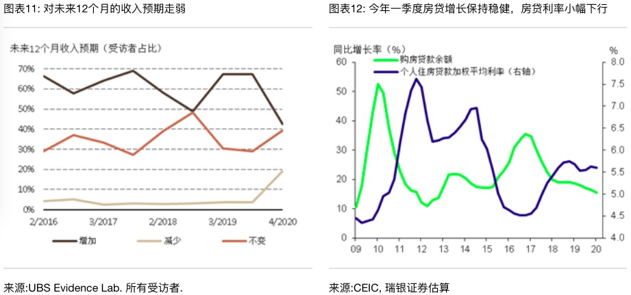 房地产销售正在回暖,但市场情绪和购房意愿下降。受新冠肺炎疫情影响,今年一季度全国整体房地产销售面积同比下跌26%,新开工同比下跌27%,房地产投资同比下跌8%(不过3月较1-2月大幅改善)。高频数据显示,4月30个大中城市房地产销售同比平均下跌了19%,但5月初其已回升至接近2019年水平。不过,与此前调查相比,本次调查中受访者未来两年(2020-21年)的购房意愿明显减弱,且今年的购房意愿也有所降温。疫情导致受访者的房价预期、购房信心和未来收入预期都大幅走弱,尤其是三线城市。同时,受访者对加杠杆贷款买房也更为保守。