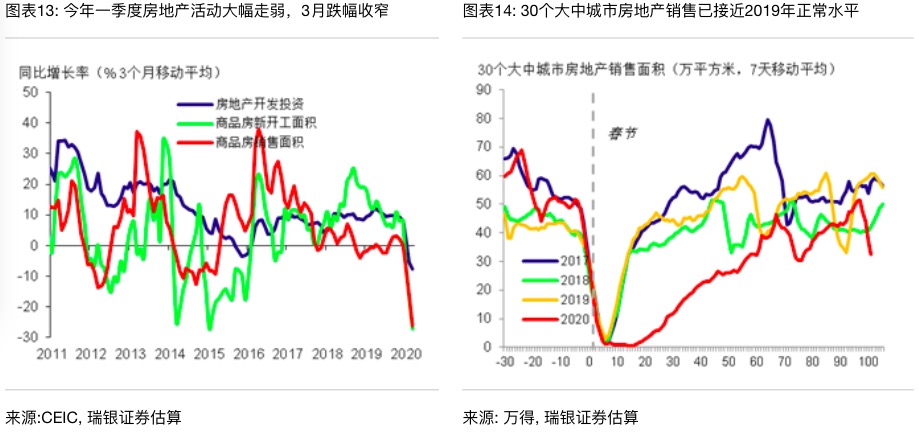 我们预计2020年整体房地产销售下跌5-7%,投资增速放缓至2-4%。考虑到新冠肺炎疫情影响、房地产市场情绪走弱,今年房地产销售跌幅可能会超出我们此前预期(此前预测为下跌2-4%)。我们依然预计中央层面全局性的房地产政策不会明显松动(如大幅降低首付比例要求或大幅下调房贷利率)。不过,我们预计地方层面房地产政策边际放松,房贷可得性提高、利率小幅下调,这应能避免房地产活动大幅收缩。2021年,受益于低基数、经济和收入增速有望强劲反弹,整体房地产销售有望小幅增长2-4%。新开工方面,开发商融资条件可能放松,应有助于部分抵消销售走弱的拖累。我们将2020年全年新开工预测小幅下调至下跌4-6%(此前预测为下跌3-5%)。鉴于2019年新开工较为强劲、开发商融资可能有所改善、今年旧城改造目标翻倍,我们认为今年房地产投资有望保持相对稳健,预计2020年增速小幅放缓至2-4%。