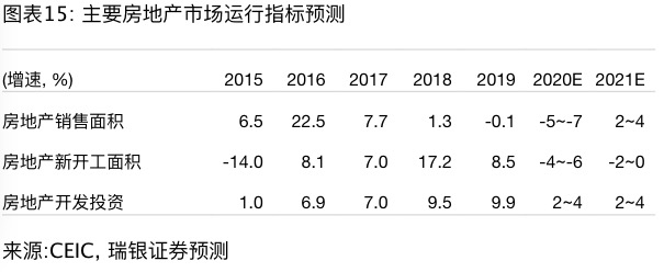 报告预计,2020年整体房地产销售将下跌5-7%,超出此前预期;投资增速将放缓至2-4%。政策层面,预计中央层面全局性的房地产政策不会明显松动,如大幅降低首付比例要求或大幅下调房贷利率等。不过,地方层面房地产政策可能边际放松,房贷可得性提高、利率小幅下调,这应能避免房地产活动大幅收缩。