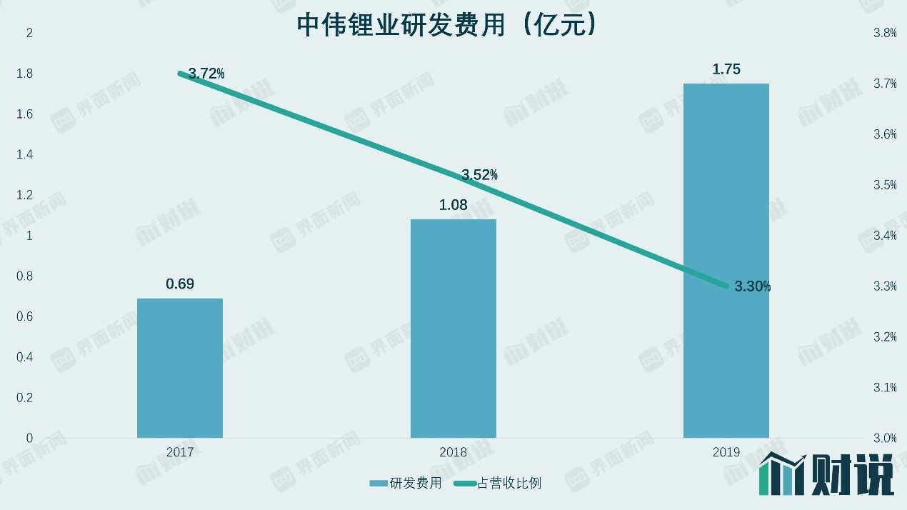 中伟股份宣称公司以技术创新驱动发展、保持研发的核心地位。然而近几年来,公司研发费用占营收比例逐年走低,2019年研发费用占比已下滑至3.3%。