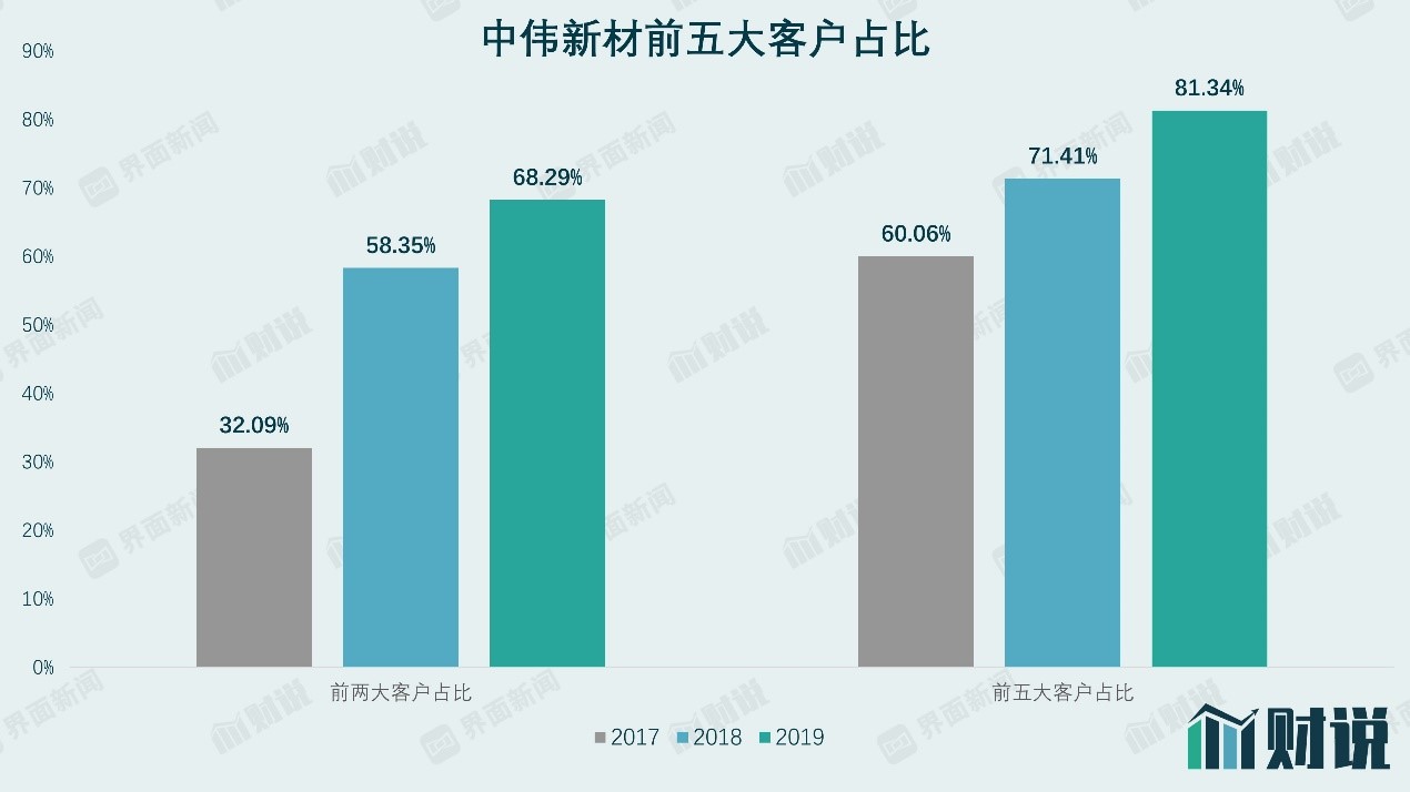 2019年中伟股份前五大客户销售金额占总营收比例为81.34%,其中前两大客户(即LG化学及厦门钨业)占比高达68.29%,公司头部客户占比较高且持续提升,存在较为严重依赖少数客户情形。