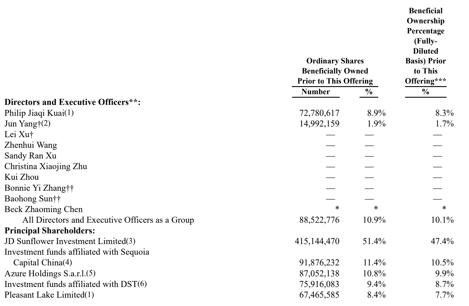 招股书披露,IPO前,达达集团创始人兼CEO蒯佳祺持有8.3%的股份,联合创始人兼CTO杨骏持股1.7%;而京东集团则持有47.4%的股份,红杉资本中国基金、沃尔玛和DST分别持有10.5%、9.9%和8.7%的股份(完全摊销后)。达达集团创始人兼CEO蒯佳祺任董事会主席及CEO。
