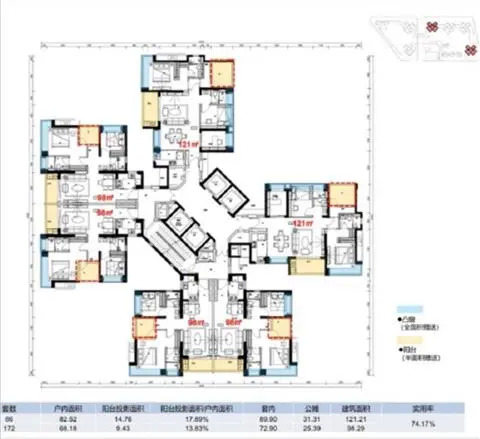 网友爆出的其中一栋户型图,4梯6户,共计258套房源,其中86套为98平方米2房、172套为121平方米3房。