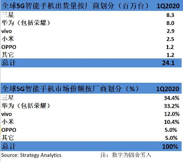 Strategy Analytics报告显示了主要品牌5G手机出货量,其中三星公司的出货量达830万台、市占率达34.4%居于首位;华为包括荣耀产品线手机在内,出货量达800万台、市占率达33.2%位居第2;Vivo出货量达290万台、市占率12%;小米出货量为250万台、市占率10.4%。