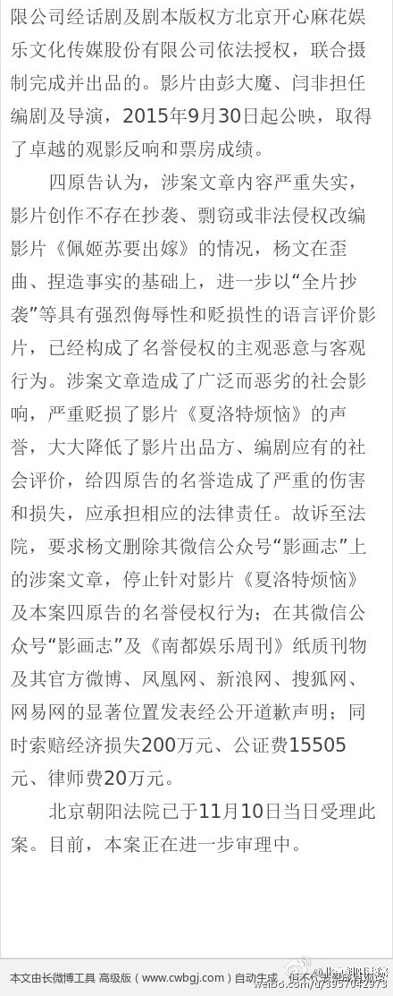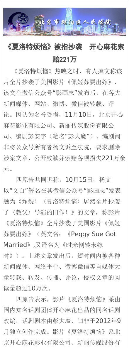 今年国庆档最大黑马《夏洛特烦恼》的抄袭风波有了下文。根据北京朝阳法院今日中午公布的信息,因文白撰文称影片《夏洛特烦恼》抄袭美国影片《佩姬苏要出嫁》,11月10日,北京开心麻花影业有限公司、新丽传媒、编剧彭大魔、闫非将文白诉至我院,要求删除涉案文章、公开致歉并索赔各项损失221万余元。
