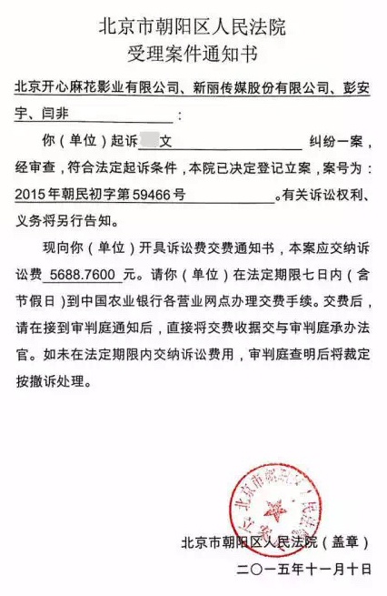 早在11月10日,盈科律师事务所律师王军在微博上发布了这一名誉维权案的案件受理通知书,并得到了开心麻花官微的转发。截至目前,被告方杨文尚未对此作出回应。