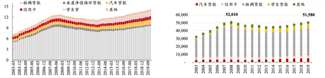 2019 年全年的居民债务余额增加6010亿美元,创下2007年以来最大年度增幅。从人均负债角度来看,截止2019年第四季度,美国居民部门人均总债务超过5万美元。