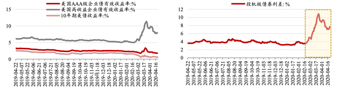 3月中旬美联储宣布“零利率政策”之后,国债收益率与投资级债券收益率都有所回落,而垃圾债收益率却快速上行,利差迅速扩大。