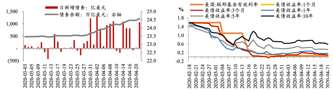 美国自20197月突破债务上限后开始大量发债,债务余额不断上升,CARES法案颁布以来更是在一个月的时间内增加了超过一万亿美元的债务,目前债务余额已超过24.5万亿美元。