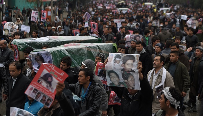 据美联社报道,当天喀布尔一直下着雨,部分民众抬着7名惨遭斩首的哈扎拉族人质遗体的棺木前往总统府,要求获得更大的安全保障以及终结针对少数民族的暴力行为。