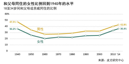 1940年,18-34岁的女性中,有36.2%和父母或其他亲戚住在一起。而皮尤研究中心周三发布的一份报告显示,2014年美国年轻女性和家人同住的比例为36.4%,创下二战以来的最高纪录。