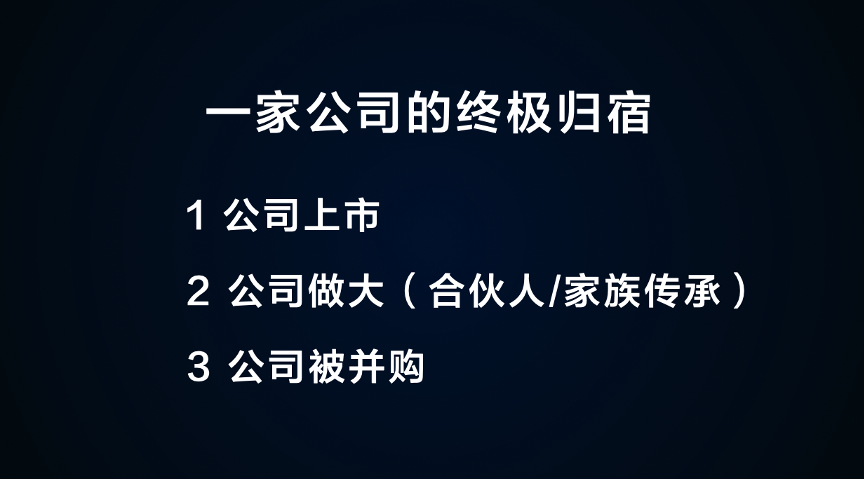 每一个创始人创办一家公司,各有各的初衷和想法,但从整体的公司发展,甚至法律上来讲,其实最终的趋势和路径没有太多的不同,大致有3类:上市,家族传承或者并购退出。