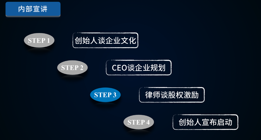 一般在宣讲中,一是创始人先讲企业文化,愿景使命价值观;二是创始人或CEO讲企业的战略规划与经营目标;三是律师补位创始人与CEO,讲股权激励实施的目的和对员工的价值。这也是在尽最大可能去调和与平衡认知差异的过程,把员工都引导到对股权激励的良好和正向的共同认知上来。