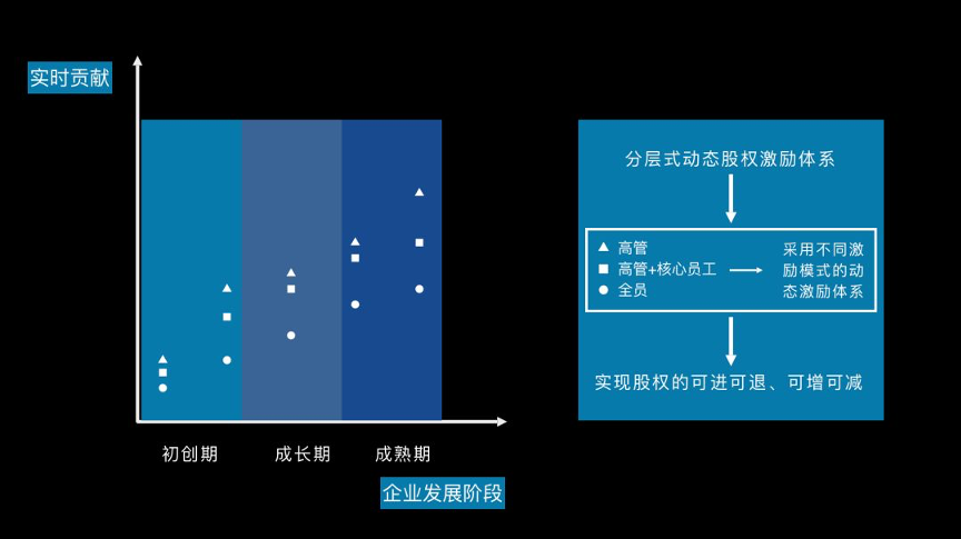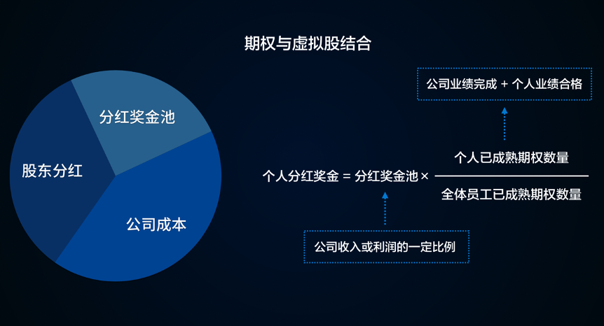 这个方法相对比较好地解决了长期的绑定和短期的利益分配。一方面员工获得的虚拟股权分红能够帮助你获得现阶段奖金的这个利益的保障,另一方面你每年获得期权归属可以期待未来长期的价值增长。把两个结合起来也是大家可以去参考和借鉴的。